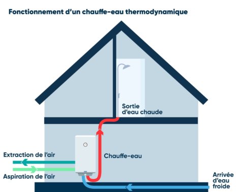 Le chauffe-eau thermodynamique est un appareil servant à la production d’eau chaude sanitaire qui utilise les calories de l’air ambiant. Il utilise une pompe à chaleur intégrée. Il doit être installé dans une pièce non-chauffée et bien ventilée d’au moins 10m² de surface. L’idéal est de l’installer à côté du lave-linge, du congélateur ou du frigidaire qui libèrent au cours de leur fonctionnement une grande quantité de calories.